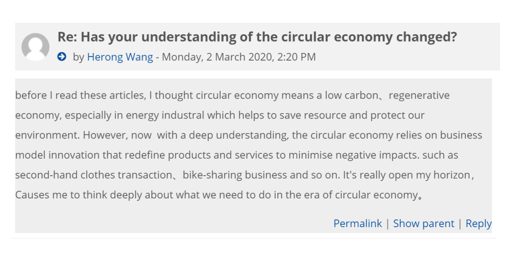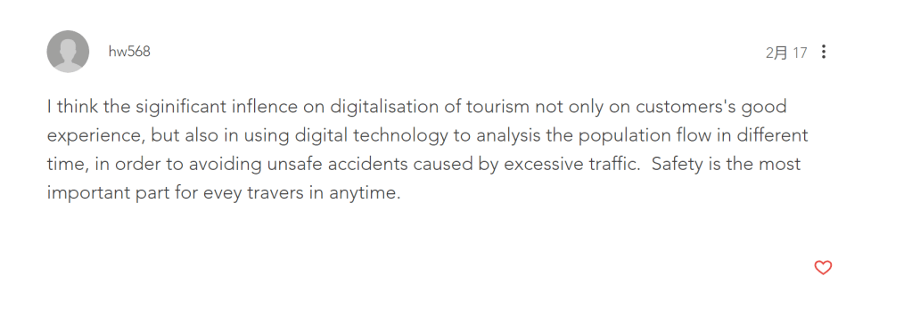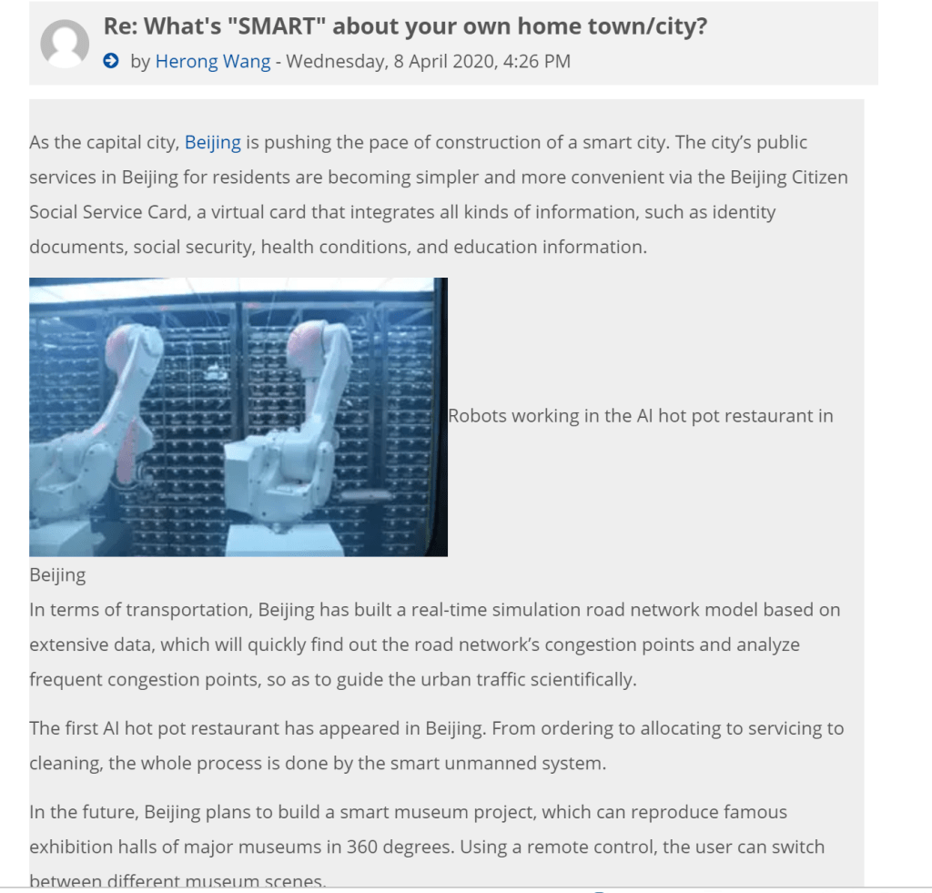 It was an eye-opener to discuss with classmates in the tutorial course and forum. Such as in the topic of smart city, I talked about Beijing, the capital of China. Through discussion, I have realized more deeply that technology will bring people a more convenient and comfortable lifestyle. (A look at Shenzhen and Huawei’s ‘smart city’ project, 2020) At the same time, I need to improve my time management. I should have done better.